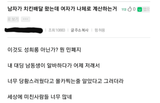 최근 한 온라인 커뮤니티에는 ‘남자가 치킨 배달 왔는데 여자가 나체로 계산하는거’라 제목의 글이 게시됐다.