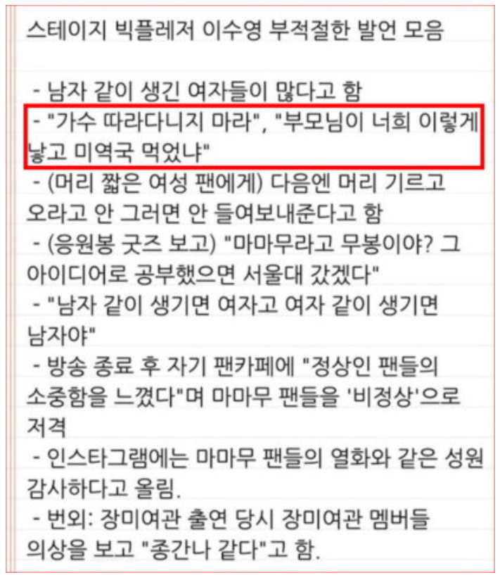 이수영은 마마무에게만 폭언을 한 것이 아니였으며, 인디밴드 ‘장미여관’에게도 “종간나 같다”라 망언을 했다.