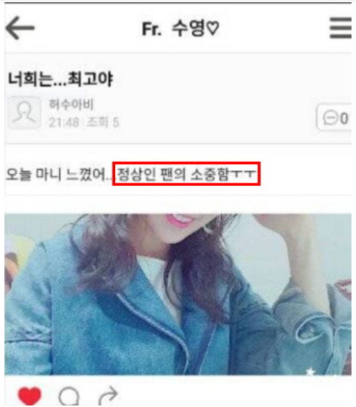 방송이 끝난 후에 그녀는 자기 팬카페에 “오늘 마니 느꼈어… 정상인 팬의 소중함ㅜㅜ”라 게시물을 작성하여 공개하며 그녀는 경솔한 행동을 멈추지 않았다.