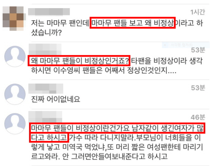 마마무 팬들이 자신들을 “비정상”라 말한 이수영의 SNS에 댓글을 남겼지만, 이수영은 “마마무 팬들의 열화와 같은 성원에 감사하다”라 비꼬는 모습까지 보였다.
