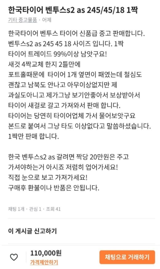 그는 “타이어는 당연히 타이어업체 가서 물어봤고요. 본드로 붙여서 그냥 타도 이상 없다고 말씀하셨습니다. 1짝만 판매합니다”, “한국 벤투스s2 as 갈려면 짝 당 20만 원은 주고 가셔야 하는 거 아시죠? 저렴히 업어가세요! 직접 눈으로 보고 가져가세요! 구매 후 환불이나 반품은 안 됩니다”라며 글을 마쳤다.