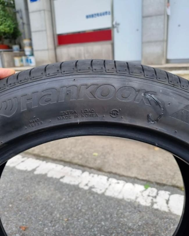 이어서 판매자는 “새 것 4짝 교체한지 이틀 만에 포트홀 때문에 타이어 1개 옆면이 패였는데 철심도 괜찮고 남북도 안 나고 아무 이상 없지만 제 과실도 아니고 제가 그냥 보기 안 좋아서 보상 받아서 타이어 새 것으로 갈고 가져와서 판매합니다”라고 말했다.