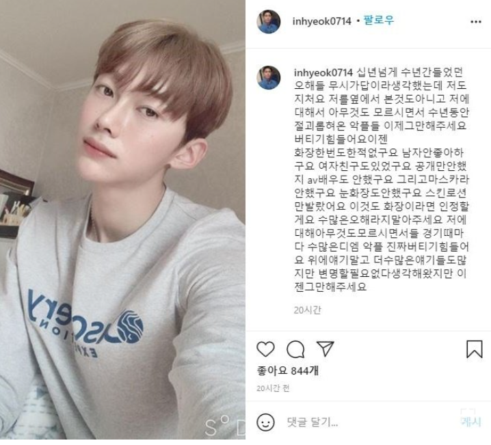 한편 김인혁은 그동안 SNS 악성 댓글로 인한 고통을 계속해서 호소해 왔다.