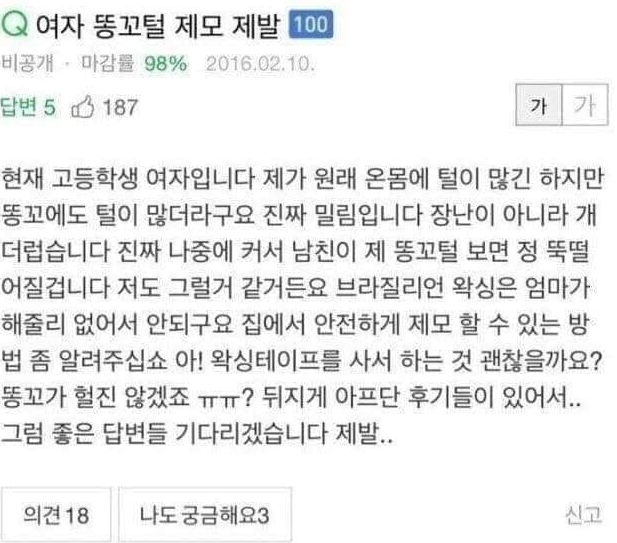 지난 2016년 한 여고생이 ‘X꼬털 제모’ 조언을 구하는 듯한 글을 지식인에 올렸다.