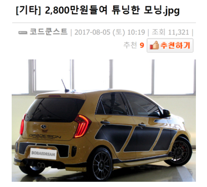 작성자 A씨는 “[기타] 2,800만원들여 튜닝한 모닝.jpg” 라는 제목의 글로 많은 이들의 궁금증을 상승시켰으며 다양한 댓글반응을 볼 수 있었다.
