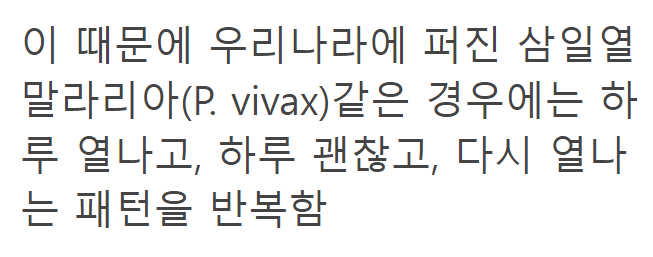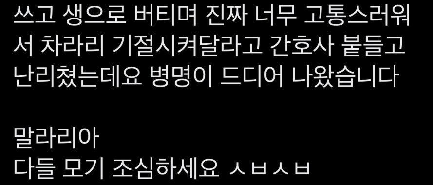 해당 병은 말라리아 모기에 물리면 나타나는 증상으로 고열이 심각하며 병명도 원인도 모르고 항셍제를 때려 붙다보니 간수치도 올라가 해열제를 못쓰고 계속해서 그냥 고열인 상태로 죽다 살아났다며 글이 올라왔다.