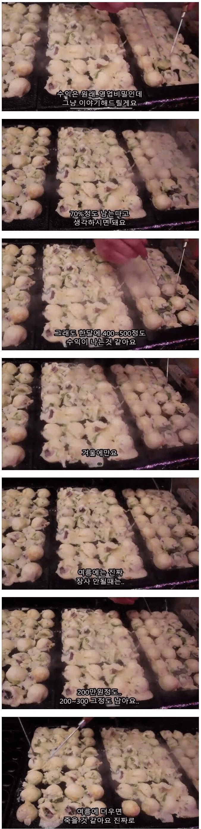 길거리 트럭에서 타코야끼를 판매하고 있는 A 씨는 “타코야끼를 팔면 70% 정도 남는다고 생각하시면 됩니다. 한 달에 400에서 500 정도 수익이 나는 것 같아요.”라며 이야기를 시작했다.