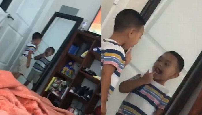 짧은 머리가 인상적인 어린 소년이 거울로 다가가 자신의 혀를 확인한다.