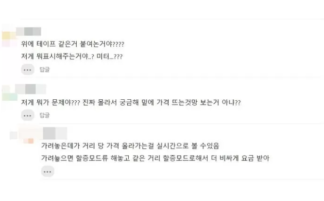 이를 본 누리꾼들은 “가려진 부분이 거리당 가격 올라가는 걸 실시간으로 보여주는 곳”이라며 일부러 그 부분을 가리고 ‘할증 모드’를 적용해 요금을 더 비싸게 나오는 것 같다고 추측했다.