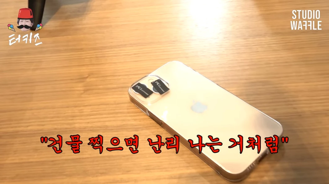유튜브 ‘터키즈 온 더 블럭’ 캡처실제 이용진의 휴대전화 뒷면과 앞면 카메라에는 스티커가 붙어있었으며 “무슨 국방부도 아니고”라며 덧붙였다.