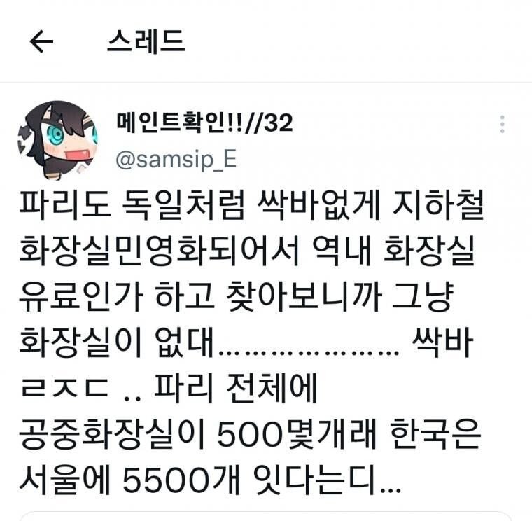 해당 내용을 접한 누리꾼들은 “나 진짜 파리에서 화장실 찾다가 바지에 쌀 뻔함”, “유럽 골목 지린내나 이유 화장실이 유료라서 노상방뇨 엄청남”, “화장실 협회 감사합니다”등의 다양한 반응을 보였다.