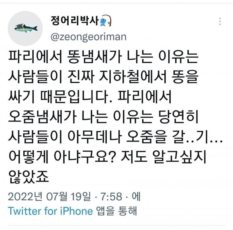 해당 글의 작성자 A씨는 “파리에서 똥냄새가 나는 이유는 사람들이 진짜 지하철에서 똥을 싸기 때문입니다”라는 문장으로 서두를 놓았다.