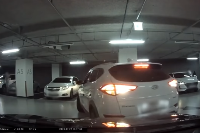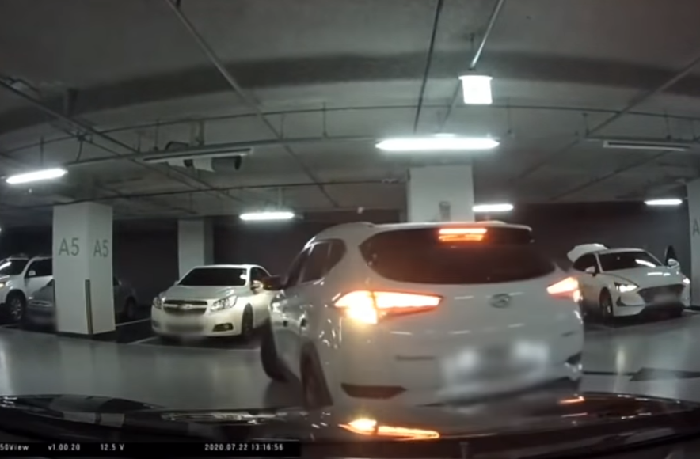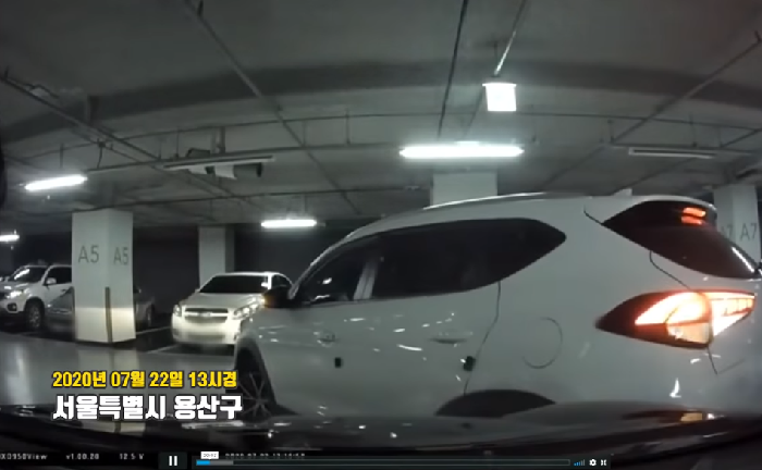 해당 영상 속 흰색 차량은 주차장에서 주차하고 있다.
