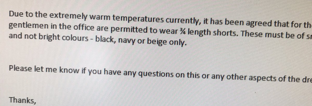 이날 오후 상사는 전 직원에게 “날씨가 너무 더워 7부 바지사용을 허용합니다.