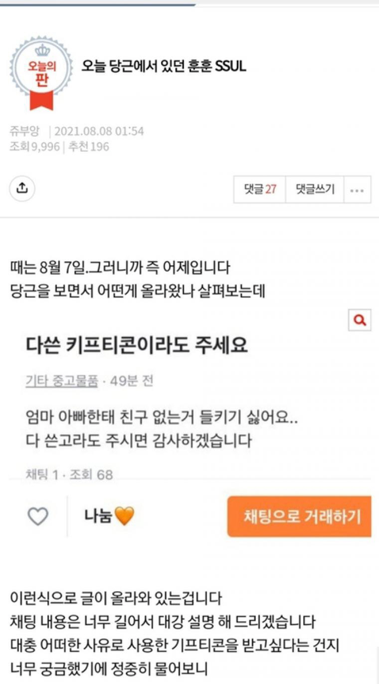 이어서 글쓴이는 “그 사람은 부모님께 친구가 없다는 사실을 들키고 싶지 않아서 사용한 기프티콘을 원한다고 하였습니다.”라고 말을 덧붙였다.
