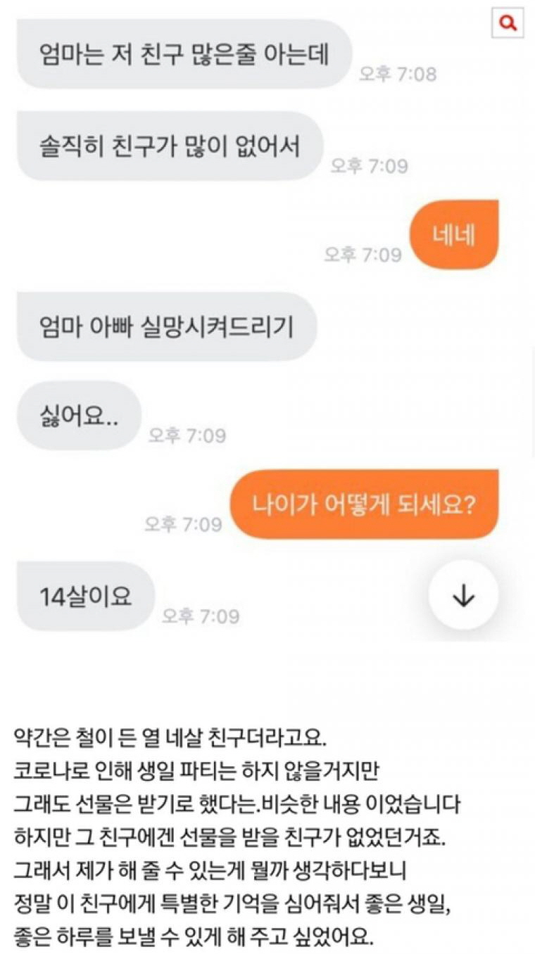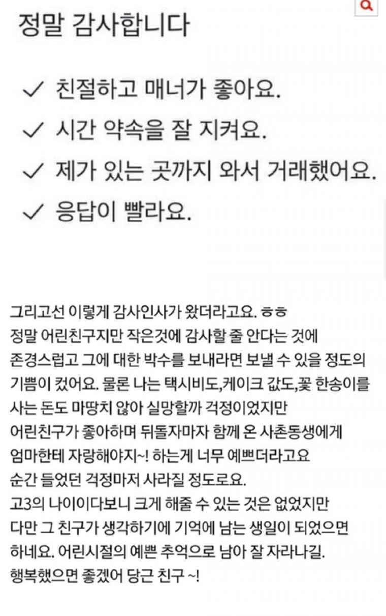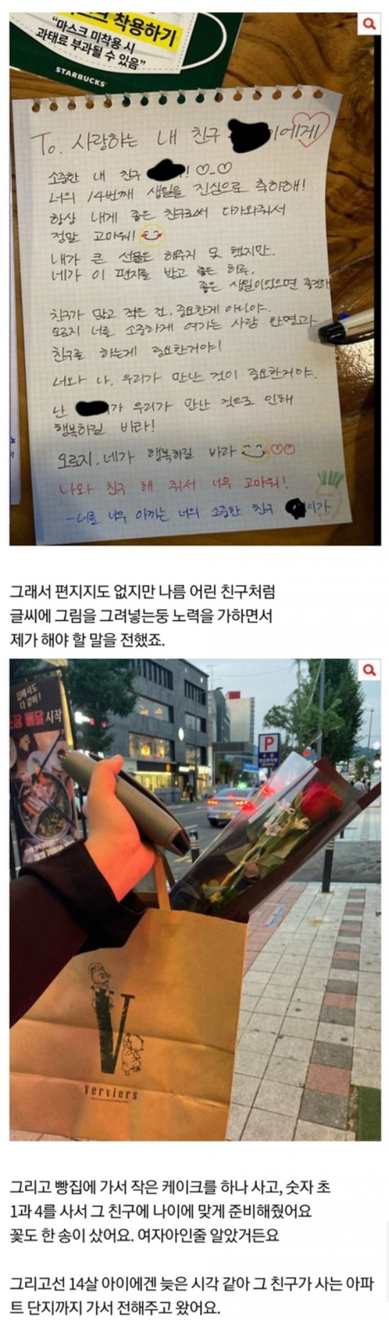 “그래서 저는 그 친구에게 직접 손편지도 써주면서 케이크와 꽃까지 선물해주었고, 그 친구에게 감사인사를 받았습니다.”라며 당시 상황을 전했다.