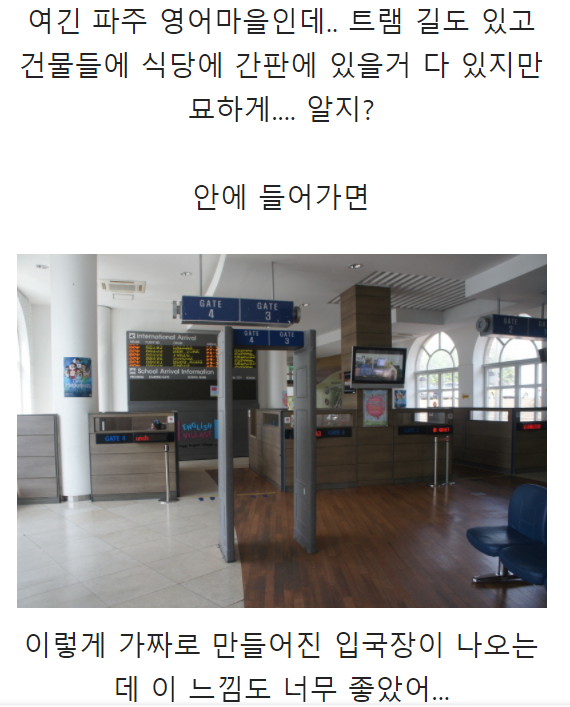 간단한 입장 이유를 묻는 정도의 입국심사도 하며, 꽤나 그럴사하게 공항을 재현해놓은 것이 깨알같다.