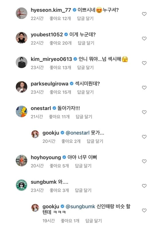 사진에 남겨있는 댓글은 “예쁘시네. 누구셔?”, “이게 누군데?”, “언니 뭐야 너무 섹시해”, “돌아가자”, “너무 예쁘다” 등의 댓글이 보였다.