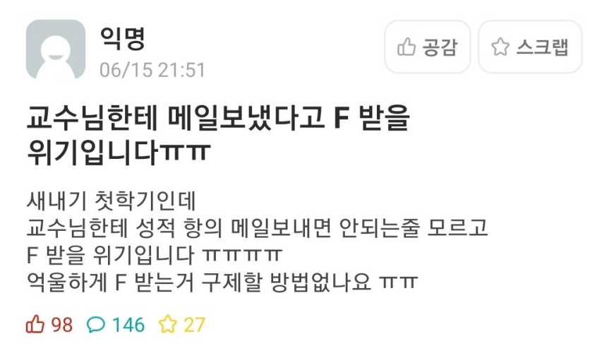 이어서 글쓴이는 “새내기 첫 학기인데 교수님한테 성적 항의 메일을 보내면 안되는 줄 모르고 F받을 위기입니다.”라고 말을 덧붙였다.