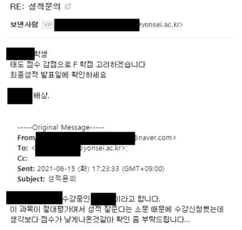 해당 메일의 내용에는 “이 과목이 절대평가여서 성적 잘 준다는 소문 때문에 수강 신청했는데 생각보다 점수가 낮게 나온 것 같아 확인 좀 부탁드립니다.”라는 내용이 적혀있었다.