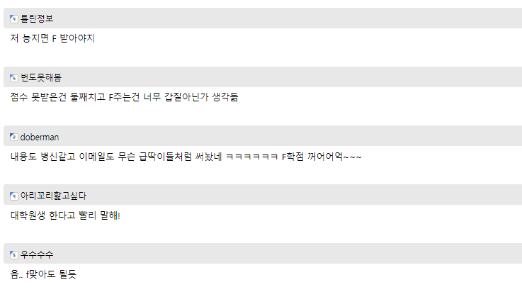 이를 본 온라인 커뮤니티 네티즌들은 “메일의 내용도 정말 형편없고, 내용도 정말 어이가 없네요. 그냥 F 학점을 받아들이세요.”, “와 고등학생도 저렇게 말은 안 할 것 같은데요?”라는 반응을 보였다.