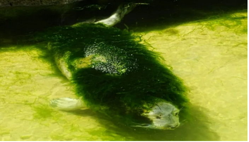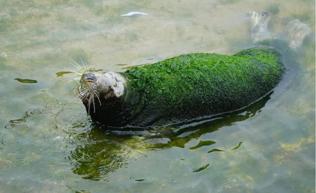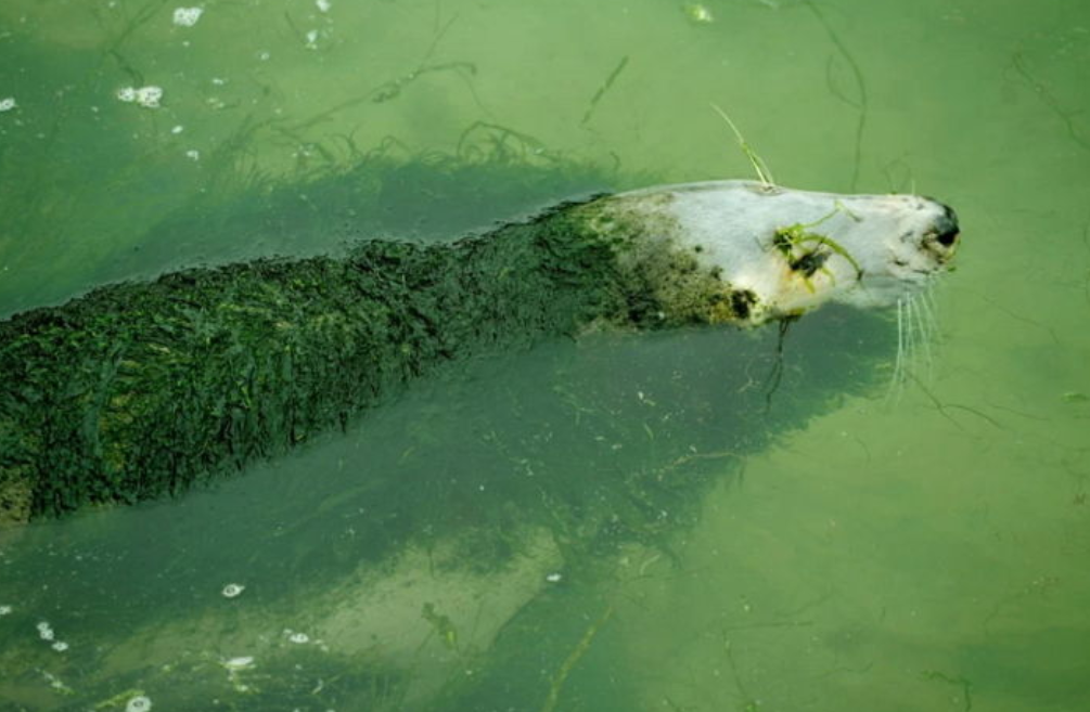 공개된 사진속 바다표범은 방치되어 해초로 뒤덮여 본 모습을 찾아보기 힘들다.