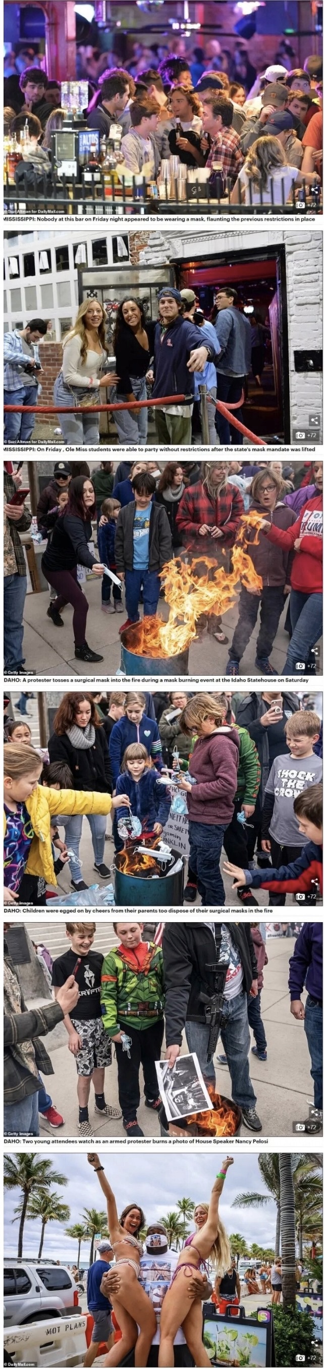 함께 올라온 사진 속 미국인들은 마스크를 벗은 채 거리를 활보했다. 심지어는 마스크를 불태우는 퍼포먼스를 보이기도 했다.