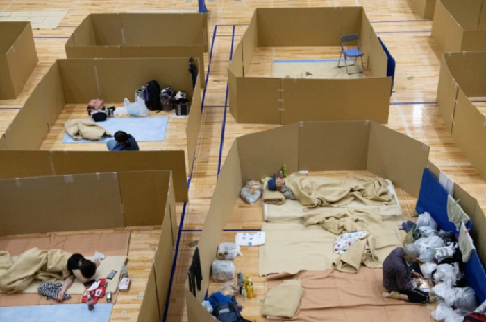 일본 정부가 홍수로 인한 이재민들의 코로나 19 감염을 막기 위해 골판지로 만든 가림막을 설치해 논란이 되고 있다.