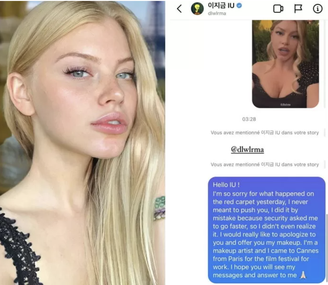 지난 28일(현지 시간) 프랑스 뷰티 인플루언서 마리아 트래블은 인스타그램 스토리에 자신이 아이유에게 보낸 DM 캡처 사진을 올렸는데 그녀는 제75회 칸국제영화제 레드카펫 행사서 아이유의 어꺠를 강하게 치고 지나간 바 있다.