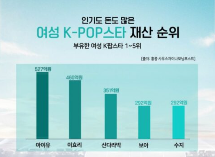 아이유는 홍콩 미디어 매체 ‘사우스차이나모닝포스트(SCMP)’에 선정한 “올해 가장 부유한 여성 K팝 스타 5인”으로 선정된 것을 볼 수 있었다.