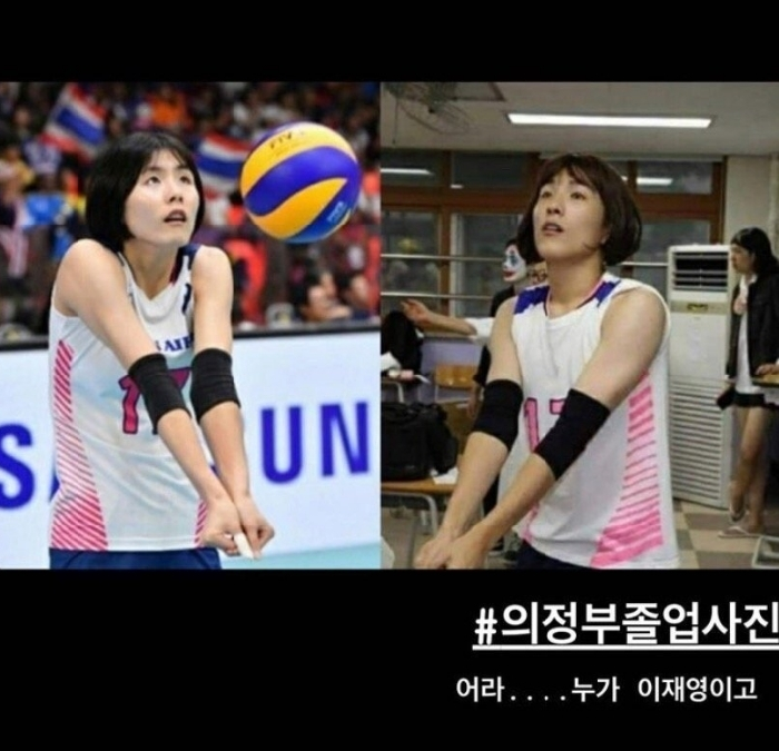 그는 배구선수 이재영과 그로 변신한 의정부고 학생의 사진을 나란히 올리면서 “어라…누가 이재영이고”라며 말했다.