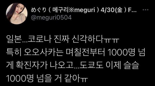 메구리는 “일본은 코로나가 진짜 심각하고, 도쿄의 확진자도 슬슬 1,000명이 넘을 것 같아.”라며 당시 상황을 전했다.