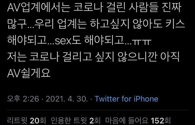 또 “AV 업계에 코로나 걸린 사람들도 많고 우리 업계는 키스도 해야 하고 성관계도 해야 해서 정말 위험해요”라며 말을 덧붙였다.