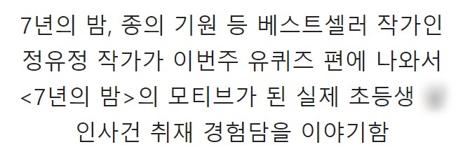 정유정 작가는 옆 아파트에서 발생한 사건을 모티브로 삼아 ‘7년의 밤’을 집필하게 됐다고 밝혔다. 정유정 작가는 “아파트에 11살짜리 사내아이를 찾는다는 전단지가 붙었다. 그걸 보는데 사람의 직감이라는 게 있지 않냐.