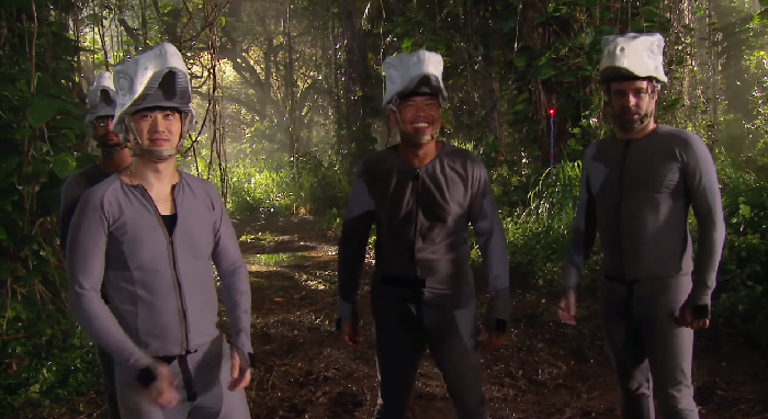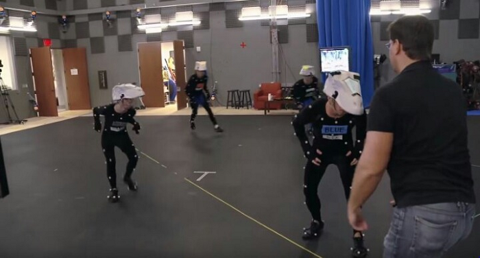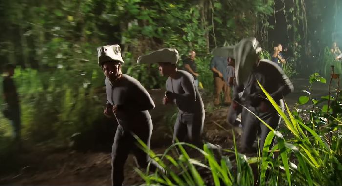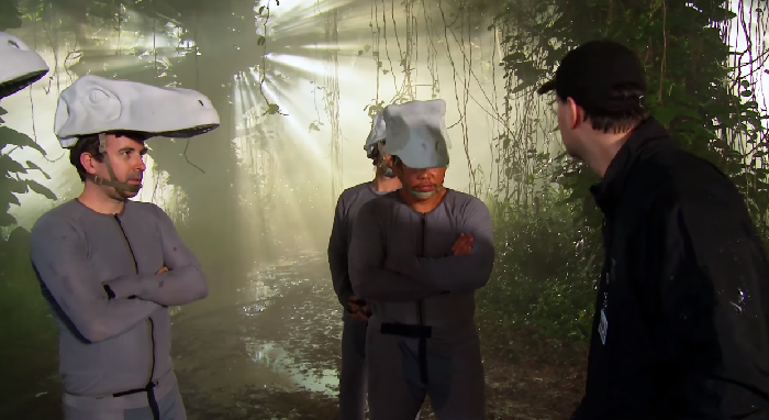 촬영 비하인드 영상 속에서 배우들은 공룡 헤드 모형을 쓰고 랩터의 몸짓을 흉내낸다.