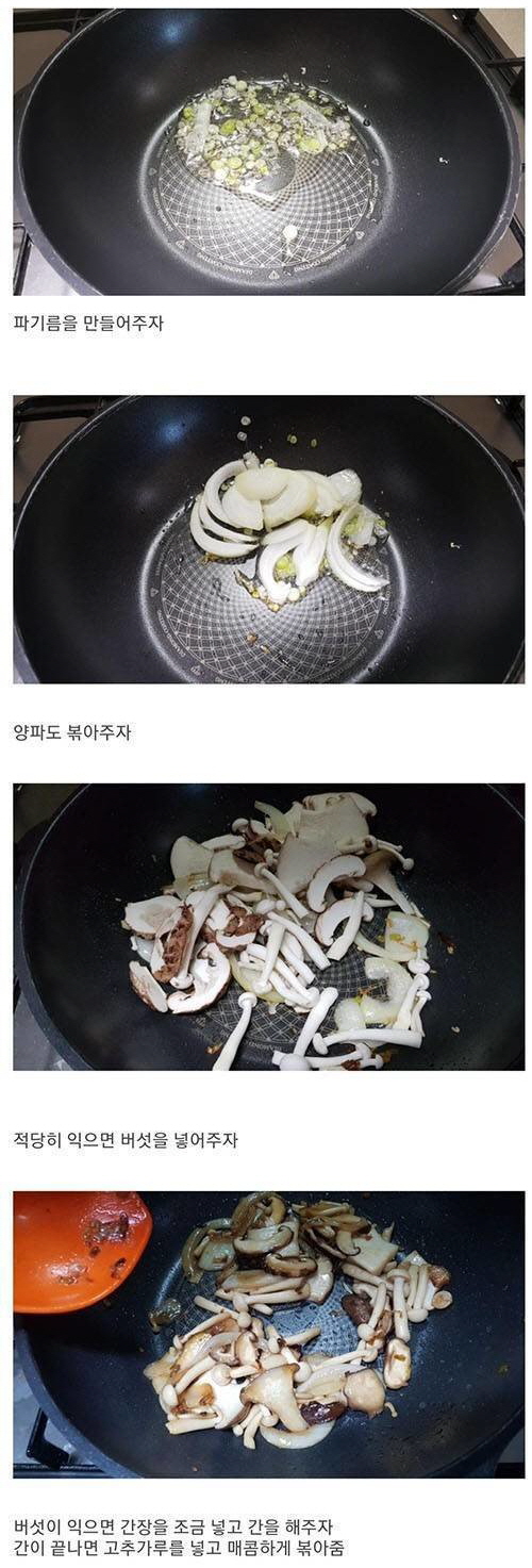 이어서 글쓴이는 “아무 라면이나 하나 준비하시고, 파 기름을 만든 후 양파를 볶고, 버섯도 익혀주면 됩니다.”라고 말을 덧붙였다.