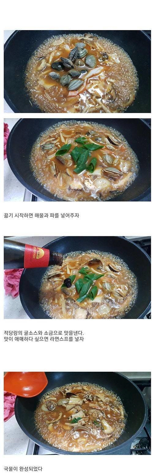 “육수를 넣고, 갖은 야채와 굴소스도 넣어주면 좋습니다.”, “미리 삶아둔 면에 국물을 부어주면 짬뽕이 완성됩니다.”라며 당시 상황을 전했다.