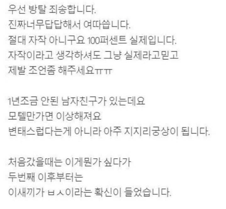 글쓴이는 1년이 조금 안 된 남자친구가 있는데 모텔만 같이 가면 이상한 행동을 한다며 이야기를 시작했다.