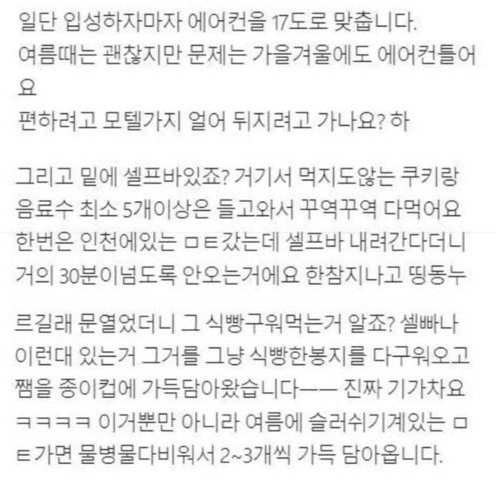 “셀프바에서 먹지도 않는 쿠키랑 음료수를 5개 이상들고 와서 다 먹고 모텔에 배치된 샴푸, 휴지 등 일회용품을 모두 챙깁니다”라며 글쓴이는 당시 상황을 전했다.