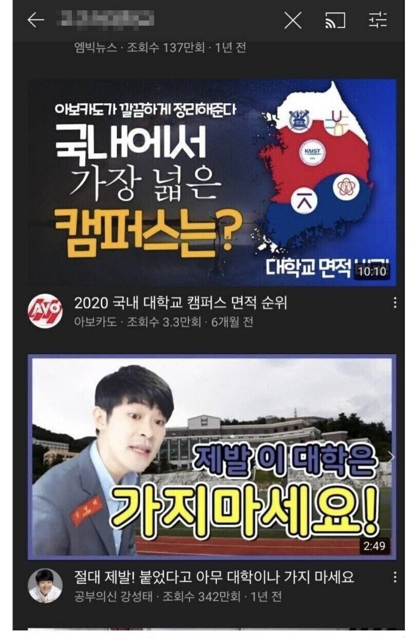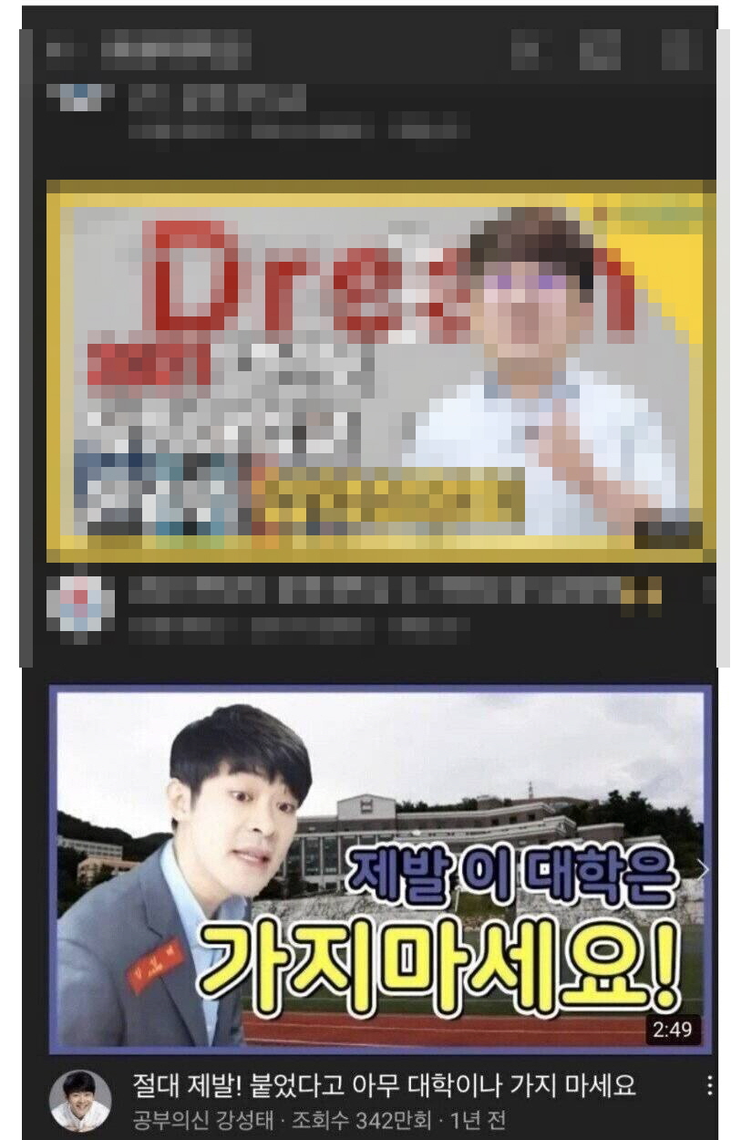 유튜브에 대학교를 검색하면 알고리즘을 통해 여러 검색 결과가 나오는데 그 중 ‘공부의신 강성태’채널의 동영상인 ‘제발 이 대학은 가지 마세요!’가 결과로 나온다면 좋지 못한 대학이라고 글쓴이는 주장했다.