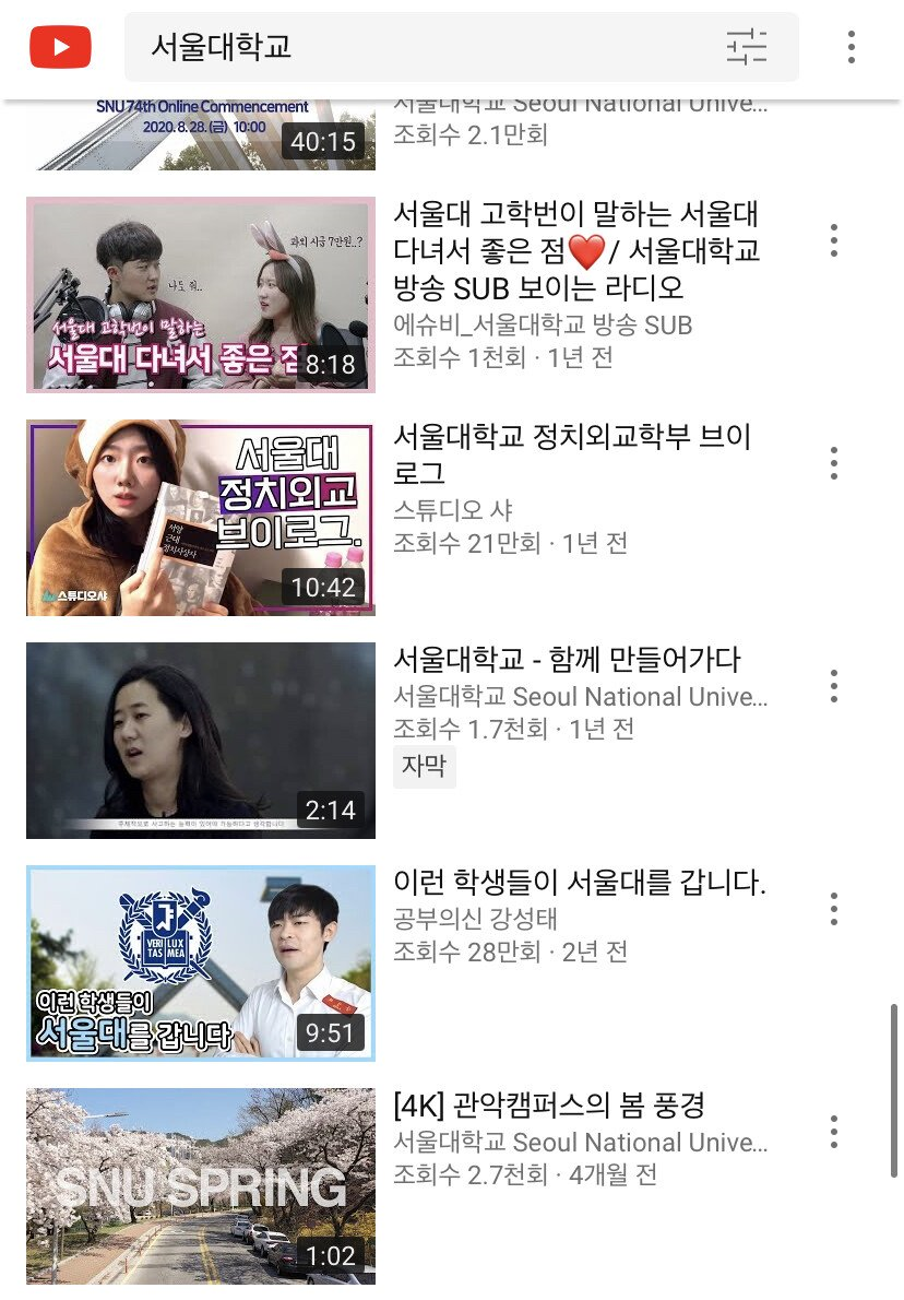 반면에 글쓴이는 “서울대학교를 검색하면 공부의신 강성태 채널의 ‘이런 학생들이 서울대를 갑니다.’라는 동영상이 결과로 나온다.”라며 말을 덧붙였다.