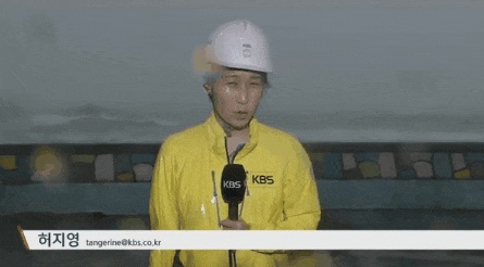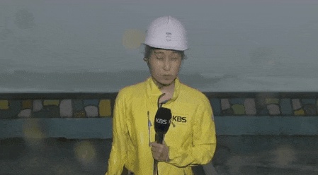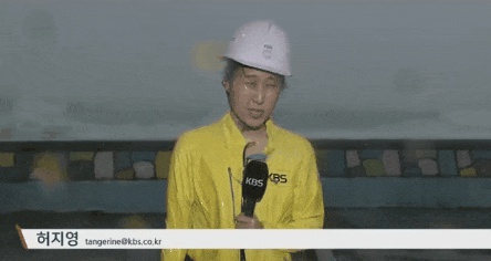 해당 기자는 비바람에도 꿋꿋하게 날씨 보도를 하고 있지만, 눈도 제대로 뜨지 못하는 모습이었다.