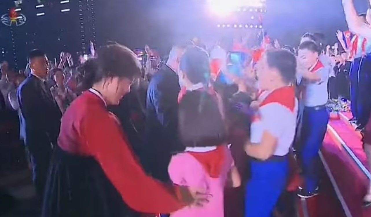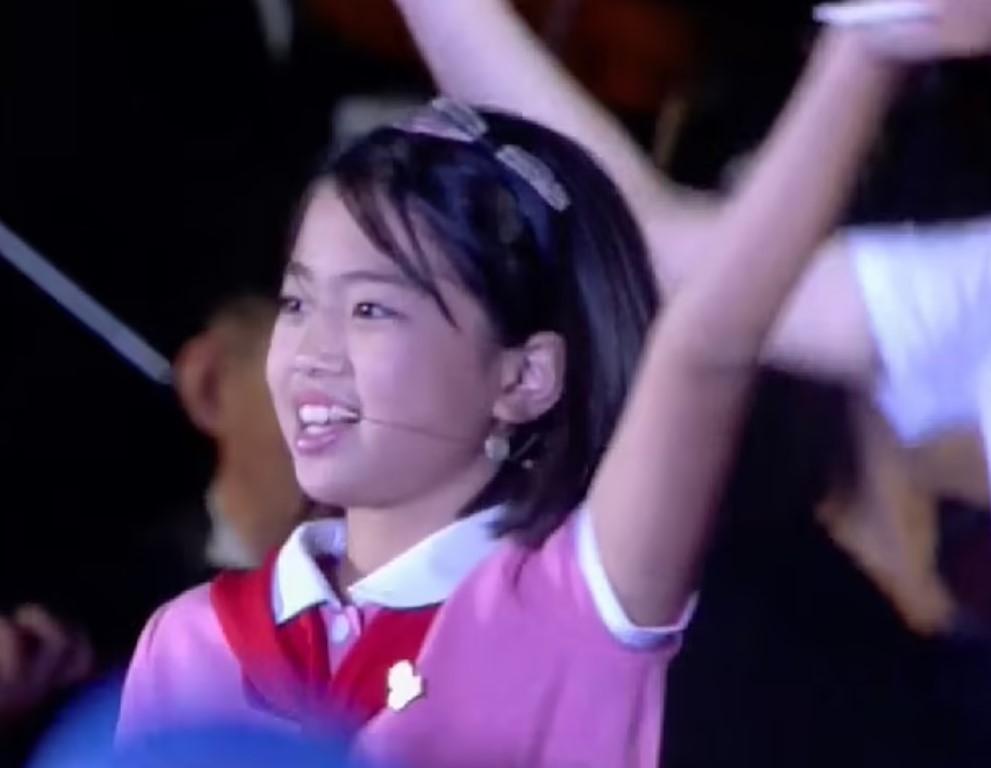 북한 측이 공개한 영상에는 유독 시선을 모으는 단발 머리 소녀가 포착됐습니다. 무대 한가운데에서 북한 국기인 인공기를 들고 열창하고 있다고 하며 독특한 헤어 스타일 외에도 유일하게 흰색 양말을 착용한 점, 수차례 스포트라이트를 받은 점 등이 눈길을 끌었다고 한다.