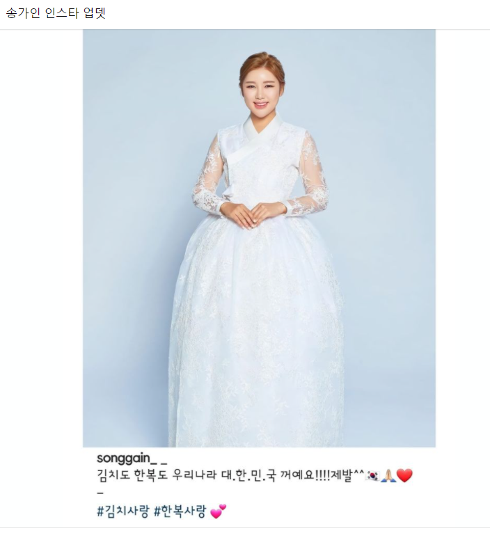 최근 트로트 가수 ‘송가인’은 자신의 인스타그램에 한복을 입은 사진과 함께 “김치도 한복도 우리나라 대한민국 꺼에요!!! 제발^^”이라는 글을 올렸다.