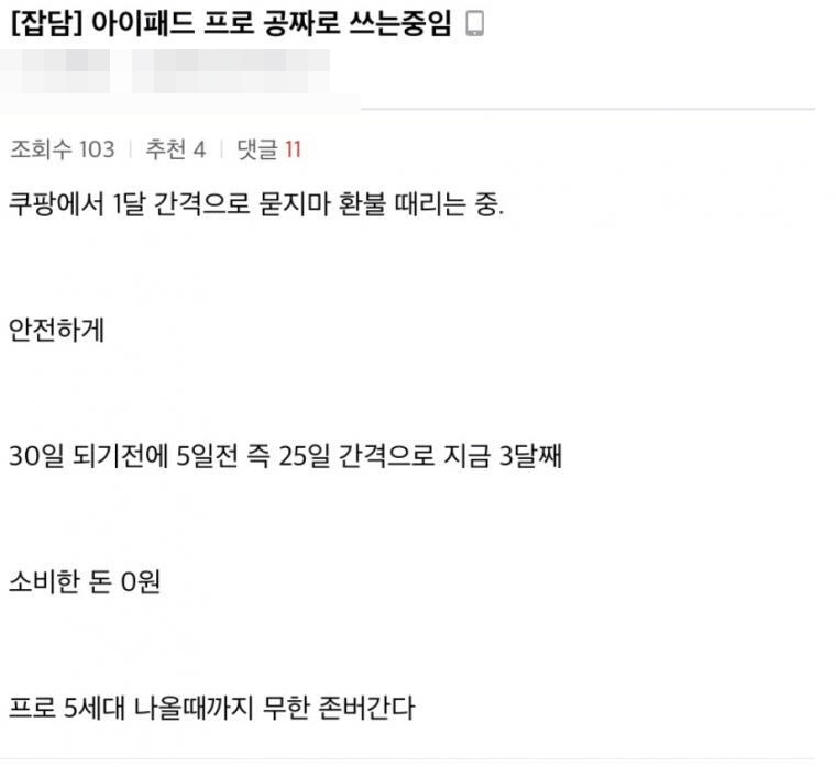 한국의 온라인 쇼핑사이트인 쿠팡에서 아이패드를 구매한 글쓴이는 쿠팡의 환불 정책을 활용해 묻지마 환불을 하고 있다며 “환불이 가능한 30일이 넘어가기전에 5일전 즉 25일 간격으로 지금 3달때 계속해서 환불하여 공짜로 사용하고있다.”라고 덧붙였다.