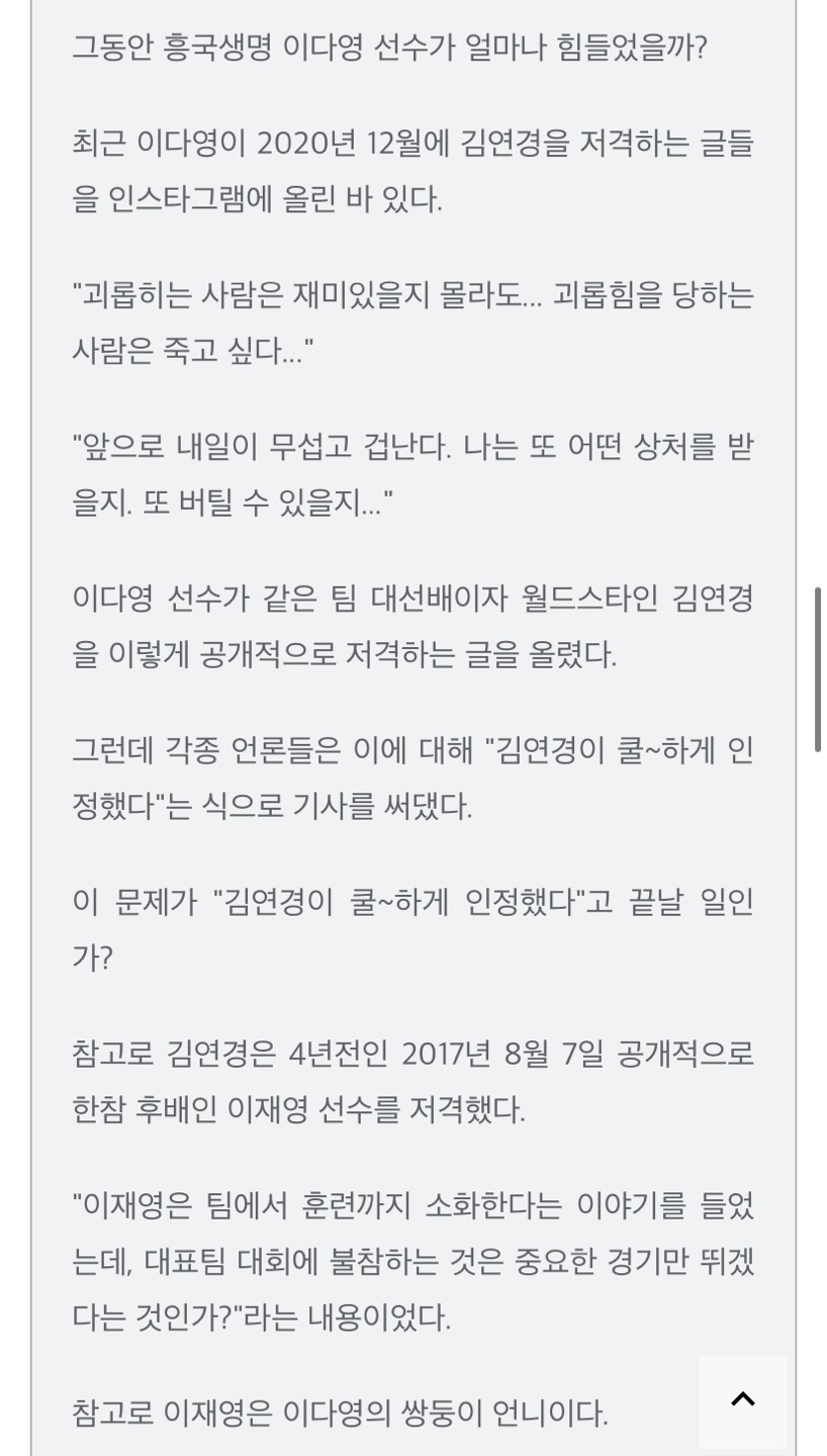 이러한 가운데, 유튜브 채널 가세연은 “그동안 흥국생명 이다영 선수가 얼마나 힘들었을까? ‘괴롭히는 사람은 재미있을지 몰라도…괴롭힘을 당하는 사람은 죽고 싶다’, ‘앞으로 내일이 무섭고 겁난다. 나는 또 어떤 상처를 받을지. 또 버틸 수 있을지’ 와 같은 글을 올림으로써 김연경 선수를 공개적으로 저격했다.