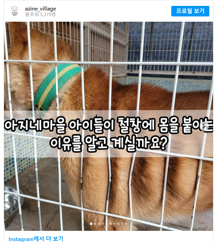 지난 4일 인스타그램 유기견 보호소 계정에 “아지네 마을 아이들이 철창에 몸을 붙이는 이유를 알고 계실까요?”라는 제목의 게시글이 올라왔다.