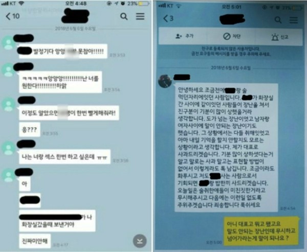 이후 임원 중 한 학생은 B씨에게 “술 취한 애들이 미친 짓 한 거라고 무시해주시고 다음에는 이런 일 없도록 주의하겠습니다. 죄송합니다”라는 사과 메시지를 보냈다.