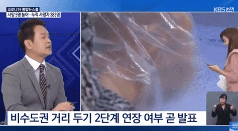 방송 당시 반으로 분할된 화면 중 왼쪽에는 이 기자의 모습이, 오른쪽에는 방역 당국으로부터 진찰을 받는 시민들의 모습이 송출 되고 있었다.