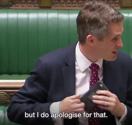 BBC가 업로드한 영상에서는 지난 3일 영국 국방장관 개빈 윌리엄슨(Gavin Williamson·42)이 의회에서 발언을 이어가던 중에 일어난 상황을 보여 준다.